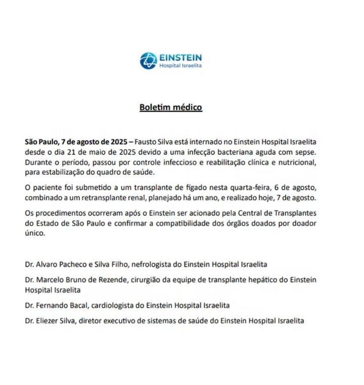 São Paulo, 7 de agosto de 2025 – Fausto Silva está internado no Einstein Hospital Israelita desde o dia 21 de maio de 2025 devido a uma infecção bacteriana aguda com sepse. Durante o período, passou por controle infeccioso e reabilitação clínica e nutricional, para estabilização do quadro de saúde.
